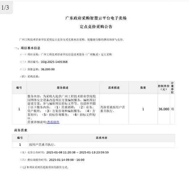 在該項目對應的采購公告中,廣州工程技術職業學院關于該項目的預算金額為最高限價3.6萬元,項目內容如下:確定一家供應商,為采購人提供廣州工程技術職業學院校園網絡安全設備改造項目方案編制服務,編制項目建設方案,參與編制項目招標文件等。包括但不限于以下服務內容:(1)需求調研;(2)業務、資產梳理;(3)方案咨詢和編制服務;(4)方案初審;(5)招標咨詢服務;(6)招標文件初審。